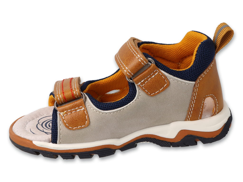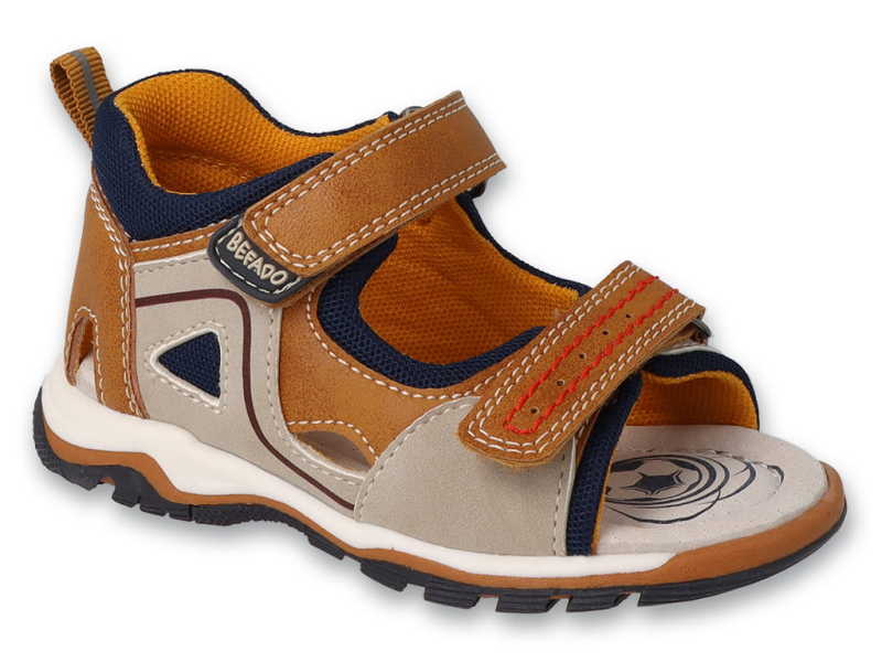 Бебешките сандали Befado Dino са предназначени за момченца, които тепърва правят първити си стъпки. Те са красиви и модерни. Затворената пета деликатно защитава крачетата, в емоционалния им порив да вървят. Сандалите са изработени от кожена, антибактериална стелка и подплата. Горната част е от висококачествена, гъвкава, мека и лесна за поддържане веган кожа. В допълнение функционалните лепки с велкро, дават великолепна възможност за припасване според ширината на крака. Меката и щадяща кожена вътрешност на сандалите, предпазват от триене с кожата на крачето. Подсилената пета гарантира правилна стабилизация на цялото детско тяло. Тъмносиния цвят, комбиниран с контрастни детайли много допада на мама и тати, търсейки първите обувки за своя принц.